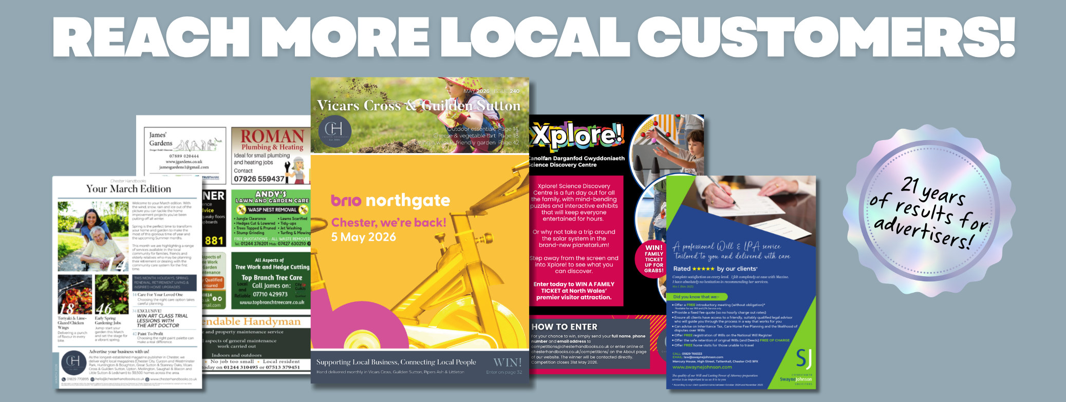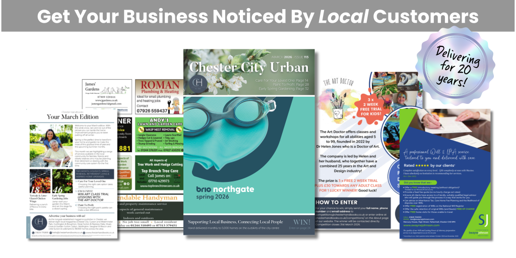 Fast forward 21 years to 2026 and we are proud to have eight local magazines with 38,500 copies dropping through letterboxes in and around Chester and Ellesmere Port every month! There isn’t much we don’t know about advertising and marketing. We take a genuine interest in each business, helping you grow your customer base and strengthen your position within your sector.